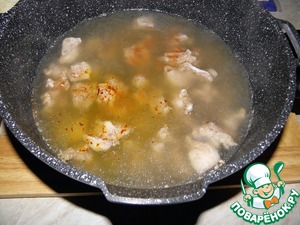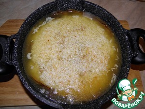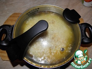 Аккуратно, ничего не перемешивая, залить 3-мя стаканами бульона
