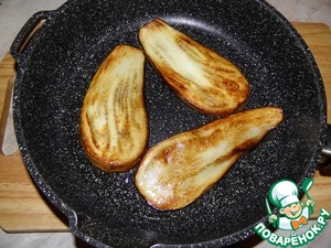 На сковороде разогреть растительной масло, обжарить баклажаны с двух сторон.