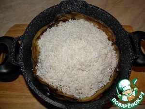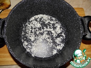 Выложить 1 ст. л риса на дно сухой кастрюли, равномерно его распределить.