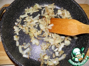 Лук нарезать, обжарить на той же сковороде, где жарились баклажаны.