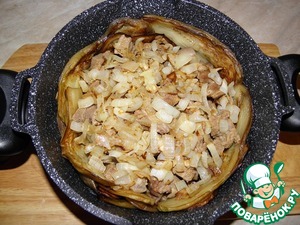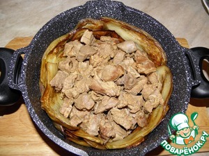 Далее, на мясо выложить лук ( можно еще по желанию добавить чеснок)