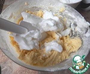 Начинаем вводить постепенно белки в тесто, аккуратно перемешивая лопаткой-после введения белков тесто станет очень нежным