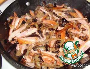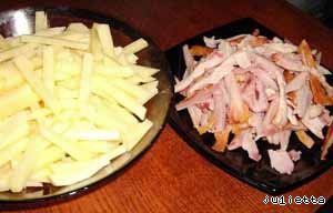 - Курица (у меня был копченый окорочек) — 150 г