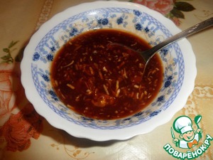 В чашку выкладываем измельченный чеснок. Добавляем кетчуп, гранатовый сок, табаско, соевый соус "Kikkoman".