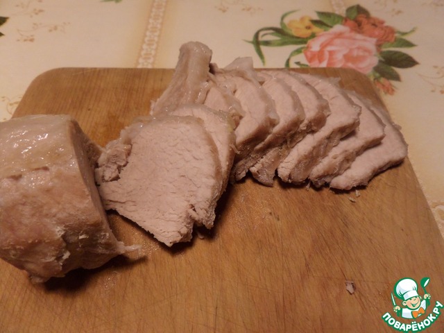 Сваренное мясо остужаем. Нарезаем ломтиками, поперек волокон.