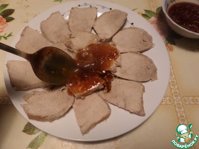 Нарезанное мясо выкладываем на тарелку. Поливаем приготовленным соусом. Накрываем тарелку пищевой пленкой и отправляем в холодильник на 2-4 часа.