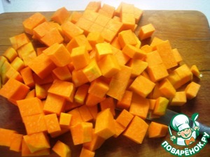 • Следом отправить обжаренные лук с чесноком, тыкву и томаты вместе с соком. Довести до кипения, затем огонь убавить и варить под крышкой до готовности тыквы. Посолить, добавить, если нужно сахар (всё зависит от томатов, которые Вы будете использовать), красный и черный перец.