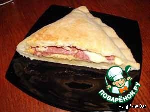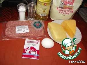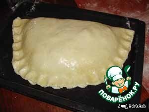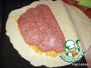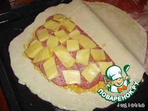 и, наконец, третий слой, состоящий из нарезанного полутвёрдого сыра. При желании все ингридиенты начинки можно перемешать заранее и выкладывать одновременно, без слоёв. Увлажните водой край теста, лежащего на противне.