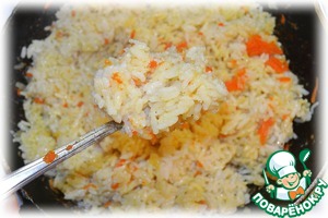 Рис получается рассыпчатым, вкусным. У меня немного осталось риса, я его с удовольствием съела просто как гарнир. Перемешать.