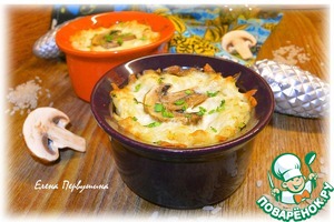 Поверх сыра в каждую порцию положить пластинку шампиньона. Смазать гриб сметаной.