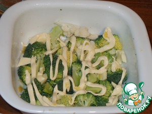 Берём глубокую форму, любого размера (зависит от количества ингредиентов). У меня небольшая квадратная. Хорошо смазываем сливочным маслом. Выкладываем брокколи, разделённую на маленькие соцветия. Поливаем майонезом. Кто любит подиетичнее, поливаем сметаной.