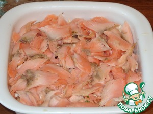 Снимаем с рыбы кожу, выбираем все кости, разделяем на пластинки (лосось очень хорошо разделяется на пластинки и выкладываем следующим слоем поверх капуст. Рыбу можно посолить и поперчить.