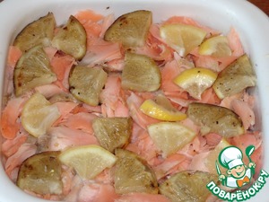 Или, 2 вариант, поливаем рыбу с лимонами майонезом или сметаной и сверху выкладываем, порезанный кружками лук-порей.