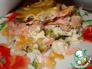 У меня был запеченный на костре кусочек лосося и немного овощей. В голове быстро родилось замечательное блюдо. Замечательность его заключается ещё и в том, что не нужно придерживаться строго количества ингредиентов, да и сами ингредиенты можно брать какие душе угодно. Я представлю в одном рецепте два своих варианта запеканки. Итак вот основная идея.