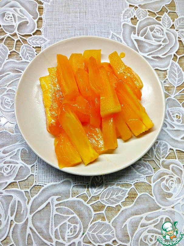 С хурмы снять кожицу, мякоть порезать брусками.