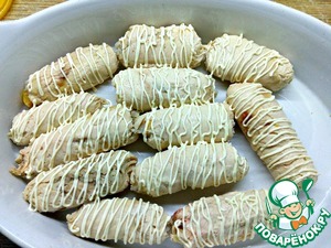 После того как рулетики немного остыли, извлекаем из фольги и перекладываем их в форму для запекания.
