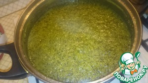 Зелень, чеснок, горький зеленый перец перемолоть и добавить в нашу кастрюлю. Посолить. Варим на медленном огне еще 15 минут, помешивая.