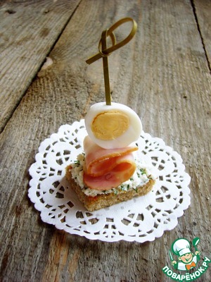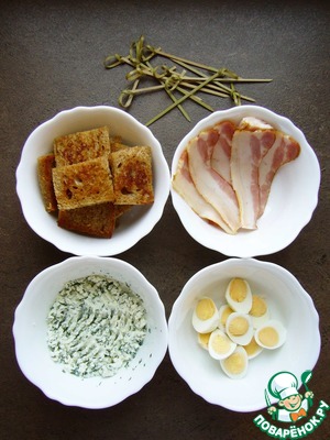 На шпажку нанизываем яйцо и бекон. Закрепляем все на смазанном фетой хлебе. Получилась очень вкусная и легкая в приготовлении закуска.