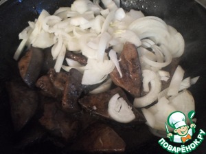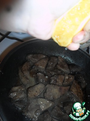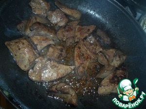 Выкладываем в сковороду разогретую с маслом. Когда печень пустит сок добавляем соевый соус и хорошо перемешиваем.