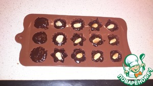 Заполним форму для конфет шоколадной массой наполовину. В середину любую начинку (у меня это жаренный арахис и кешью).