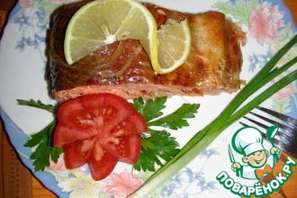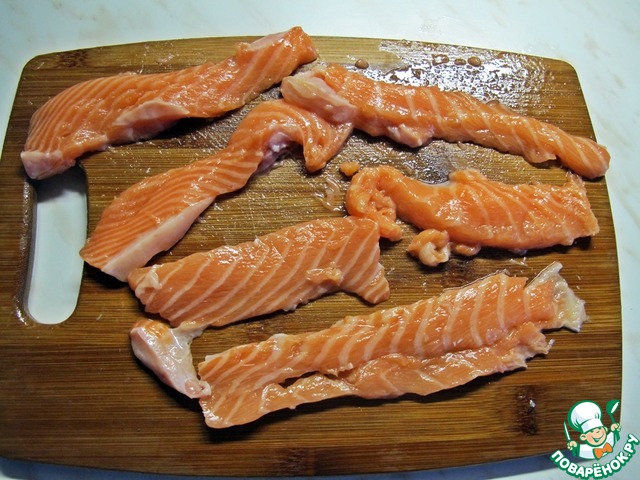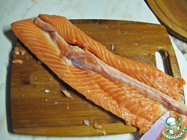 Этот рецепт хорош тем, что для него подходит абсолютно любая филейная часть красной рыбы. Я использовала тешу кеты, это бескостная часть брюшка, довольно жирная, что хорошо подходит для рецепта. Осталось только удалить кожу и распластовать ее пополам..