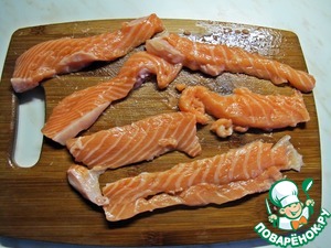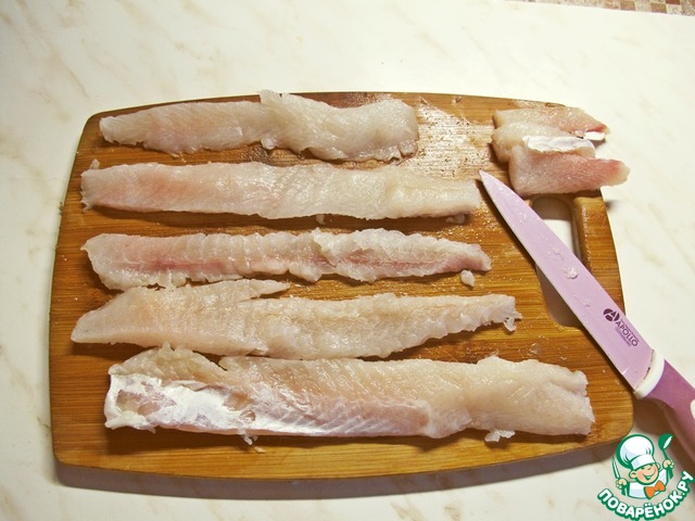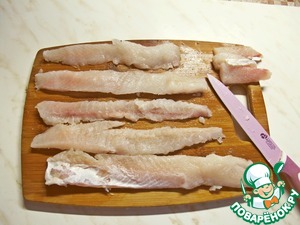 В качестве белой рыбы, я взяла филе судака. Филе нарезаем полосками на шесть полосок. Особой красоты можно не добиваться.