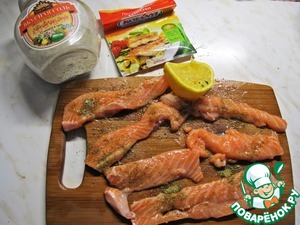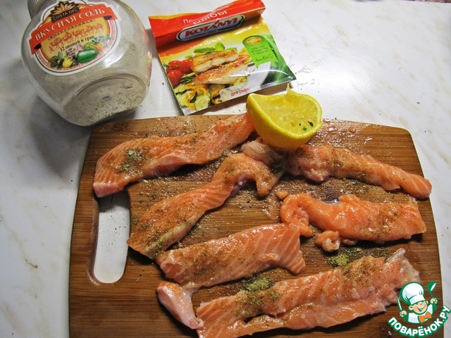 К обеим нарезкам применяем правило трёх "П" для рыбы — подкислить, поперчить (я использую специи для рыбы), посолить.