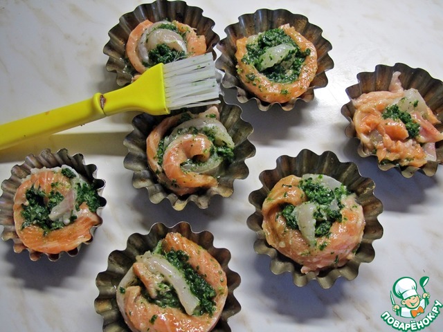 Жаропрочные формочки смазываем растительным маслом, укладываем в них рулетики и расправляем, формируя "розочку". Смазываем сверху растительным маслом и отправляем в духовку на 25 минут при температуре 190°С.