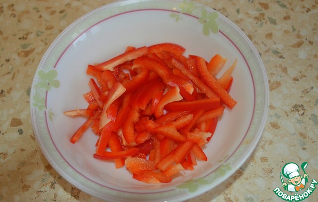 Пока варятся спагетти, режем болгарский перчик длинными, тонкими ломтиками.