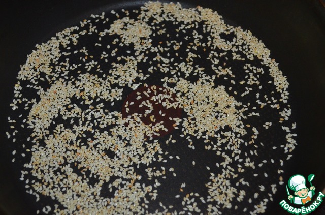 Кунжут слегка обжариваем на сухой сковороде, высыпаем в отдельную ёмкость, его добавим в самом конце.