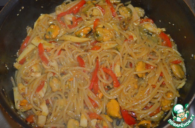 Если у кого-то есть вок, возьмите его. У меня его нет, делаю в обычном сотейнике. Подсолнечное масло хорошо разогреть, теперь, после добавления каждого ингредиента надо постоянно перемешивать. Крышкой не накрываем! В разогретое масло сначала добавить нарезанный перец, обжариваем пол минуты, затем мидии с кальмаром, обжариваем пол минуты, добавляем соевый соус и имбирь, обжариваем полминуты, затем спагетти (откинутые на дуршлаг), кунжут и разведённый в воде крахмал. Всё тщательно перемешиваем и выкладываем. После добавления крахмальной воды, блюдо станет красивым и глянцевым!