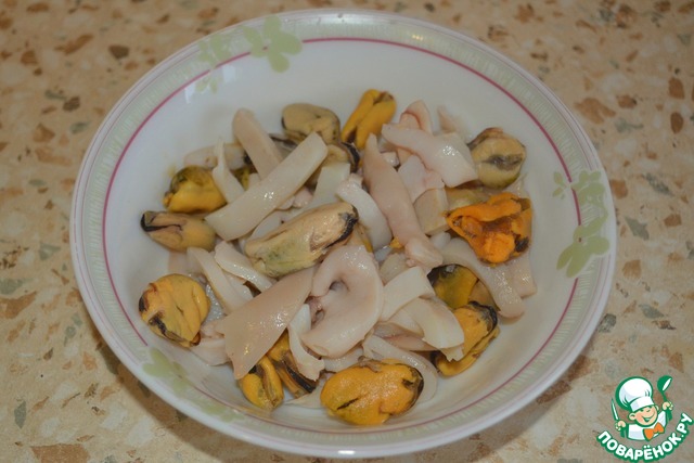 Подготовим морепродукты, кальмары и мидии разморозить и слить жидкость (если у вас кальмар неочищенный, размораживаете, и в кастрюльке постепенно заливаете его кипятком, выдерживаете там минутку, всё ненужное свернётся, вам останется только промыть его в чистой воде и снять плёнку.) В данном рецепте можно использовать морской коктейль (500гр)