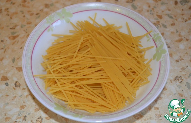 Полпачки спагетти ломаем произвольно, можно оставить длинными, на вкус это не повлияет, кому как удобно. Отвариваем в немного подсоленной воде до готовности.