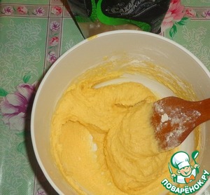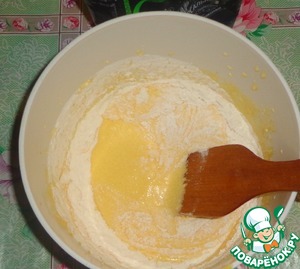 Деревянной лопаточкой вмешиваем в тесто муку и разрыхлитель теста.