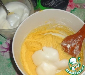 Взбить белки и добавить их в тесто, также перемешиваем деревянной лопаточкой. Тесто готово!