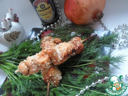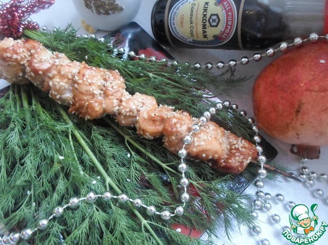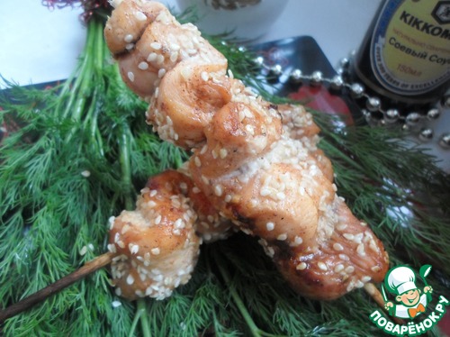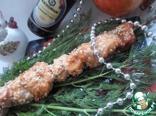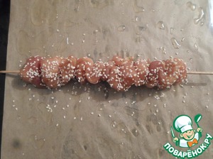 На противень застеленный бумагой для выпечки (я не много смазала растительным маслом, т, к не очень люблю совсем диетические блюда) выкладываем шпажку и обильно посыпаем кунжутом со всех сторон. Запекаем 15 минут при температуре 200-220 градусов.