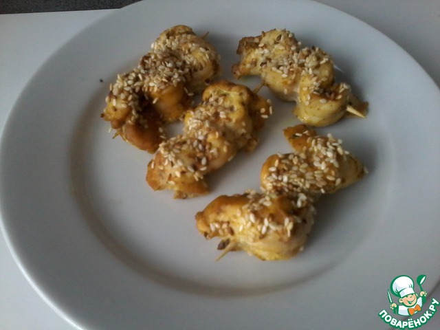 • На противень застеленный бумагой для выпечки (я не много смазала растительным маслом, т, к не очень люблю совсем диетические блюда) выкладываем шпажку и обильно посыпаем кунжутом со всех сторон. Запекаем 15 минут при температуре 200-220 градусов.
