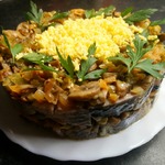 Даем ей полностью остыть. Формируем блюдо, чередуя слоя селедочки и обжарки. Количество слоев будет зависить от диаметра Вашей тарелки. Я выложила в кулинарное кольцо диаметром 17см. и украсила измельченным желтком и зеленью сельдерея. У меня получились 2 слоя селедочки и два обжарки. Блюдо накрываем пищевой пленкой и отправляем в холодильник на 3 часа (можно и дольше).