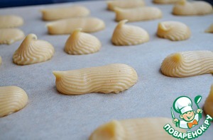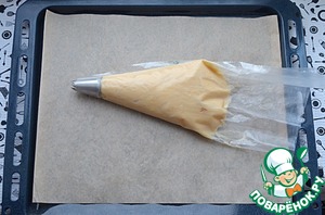 Перекладываем тесто в кондитерский мешок, а противень застилаем бумагой для выпечки.