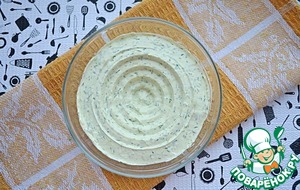 Для финишной заливки в отдельной ёмкости смешиваем оставшиеся 200 мл сметаны, зубчик чеснока и соль.