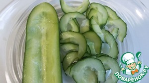 • Остальной огурец разрезать на две половинки, убрать середину и нарезать очень тонкими ломтиками