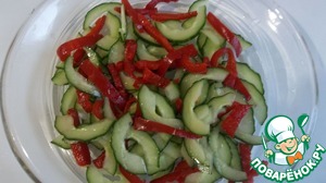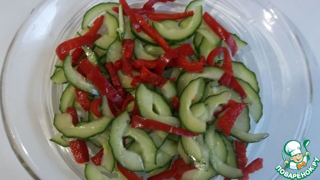 • Перец нарезать тонкой соломкой, смешать с огурцом, посыпать солью и убрать на 30 минут