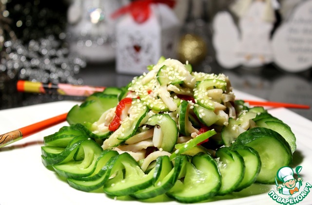 Японский салат с кальмарами и овощами под пикантно-свежей заправкой всегда найдет себе место на праздничном столе! Очень легкий и освежаюший, он станет прекрасным дополнением к мясным блюдам и придется по вкусу тем, кто следит за своей фигурой!