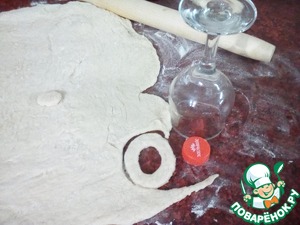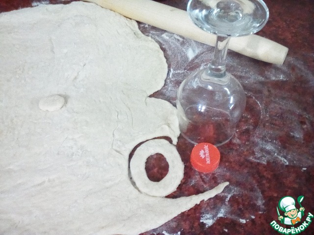Подросшее тесто раскатываем (толщина 1 см) и с помощью стакана и крышки делаем форму пончика.
