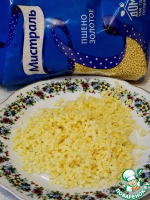 Наш главный ингредиент. Мне очень нравится пшено от "Мистраль", его не надо перебирать, оно не слипается и прекрасно подходит для запеканок. Пшено сварить согласно инструкции, добавив в воду соль и 30 гр. сахара. Оно должно быть рассыпчатым.