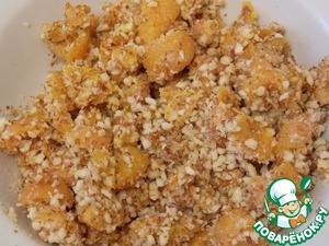 Курагу вымыть, порезать небольшими кусочками и залить на 15 - 20 мин. коньяком. Орехи измельчить в некрупную крошку. Курагу вынуть из коньяка и смешать с орехами.