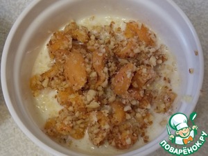 Желтки взбить с сахаром, добавить сметану еще раз хорошенько взбить, всыпать пшено, перемешать. Масса получится жидковата, но пусть это Вас не смущает. Формы смазать маслом, наполнить на 1/3 объёма и положить начинку. Сверху кладем еще пшенную смесь и разравниваем.