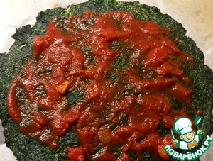 Запеките в духовке примерно 15 минут. Достаньте и пару минут охладите. Сверху обильно намажьте томатной пастой.