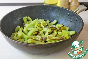 Обжарить кабачок на сильном огне в течение 2 минут, на 1-2 ст. л. растительного масла, присолить и выложить к овощам.