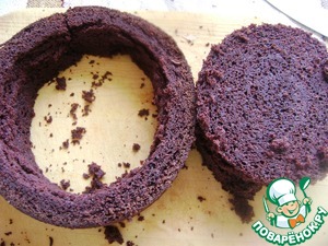 Выложить в разъемную форму нижний корж, на него поставить кольцо из середины. -